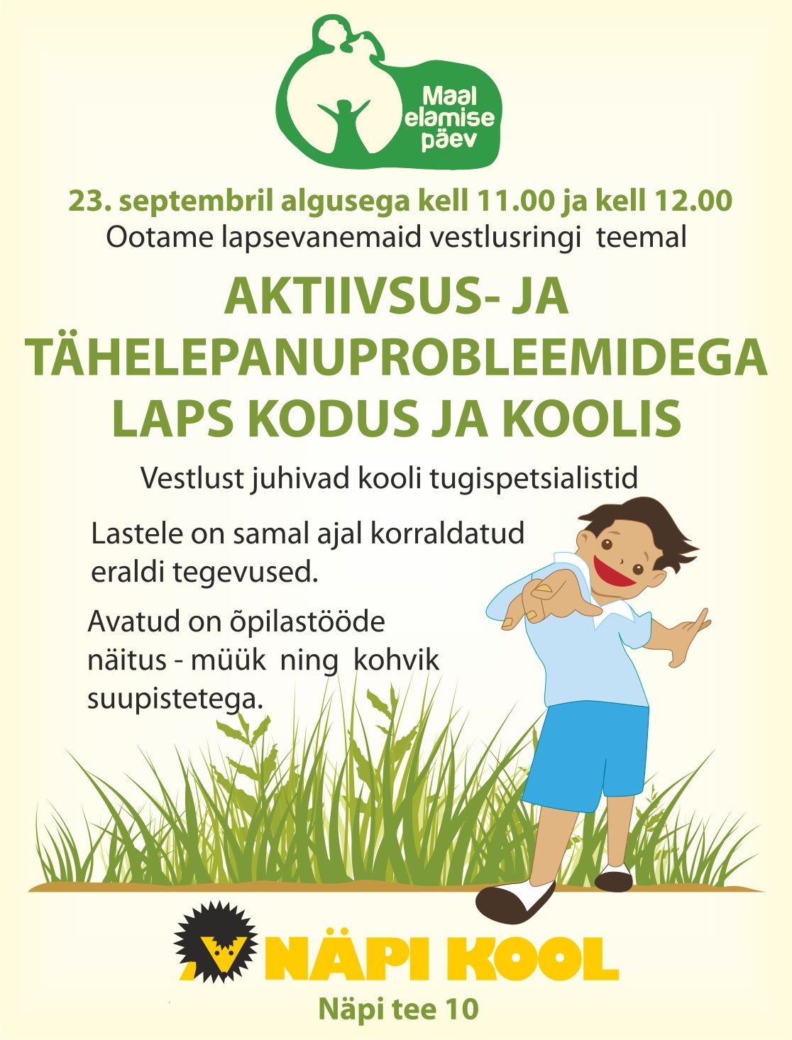 Kutsume ühinema vanemaid, kellel on laste kasvatamisel tekkinud küsimusi ja muresid. Püüame anda asjakohast nõu ja tuge ning kaasame vajadusel eksperte. Vestlusringi läbiviijateks on Näpi kooli tugispetsialistid.