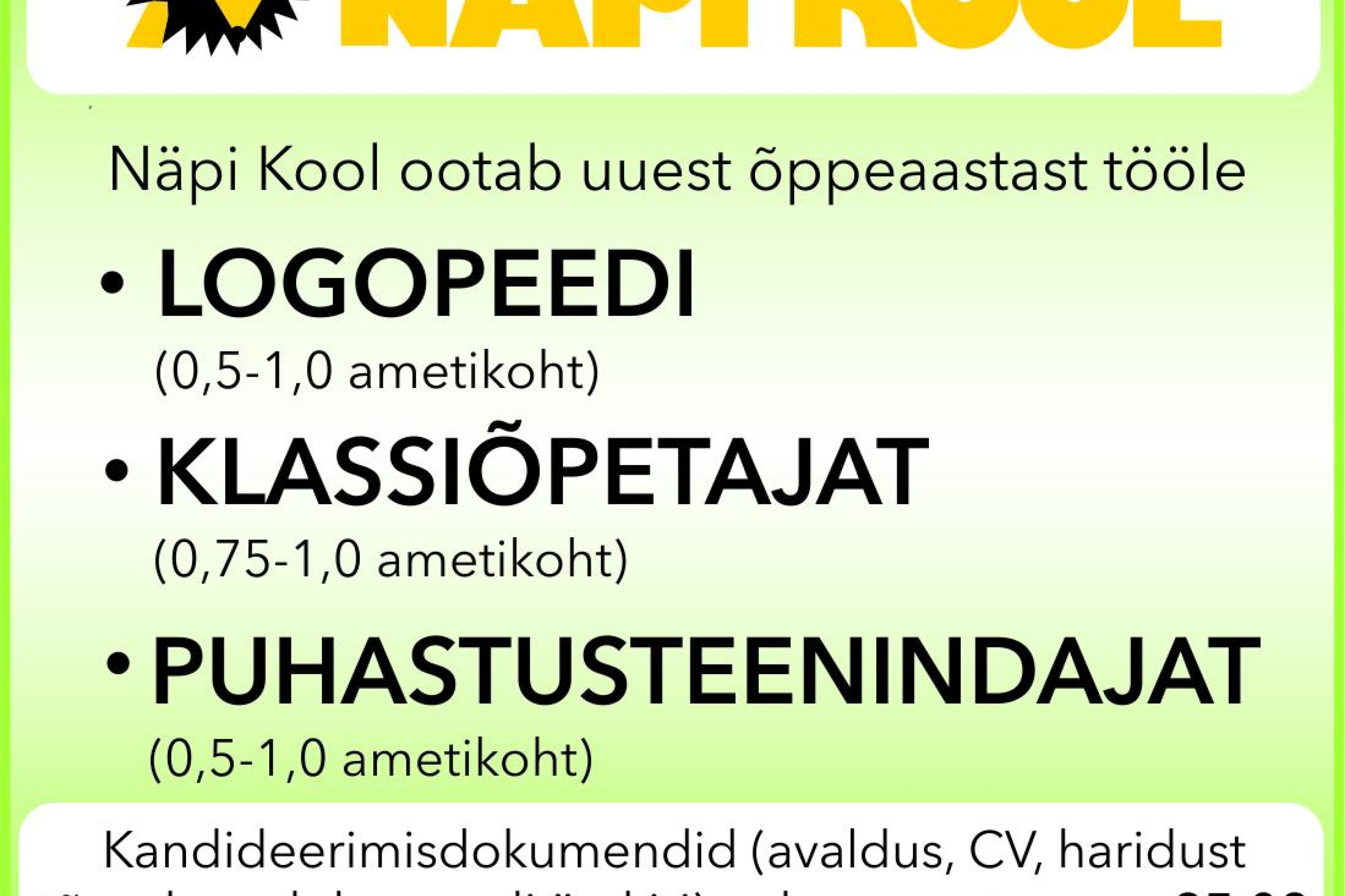 Kandideerimisdokumendid (avaldus, CV, haridust tõendava dokumendi ärakiri) saata enne 25.08 aadressil info@napi.edu.eelink opens on new page või tuua Näpi, Näpi tee 10. Info telefonil 5682 8960.